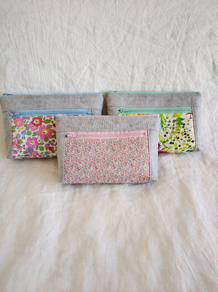 The outer is constructed of Essex Yarn Dyed Linen in grey. This fabric has a metallic thread running through it which gives the pouch a subtle shimmer.