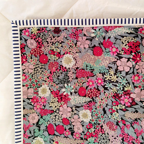 This cushion features the Liberty of London print 'Ciara B' which features pink, white and aqua flowers on a dark background.