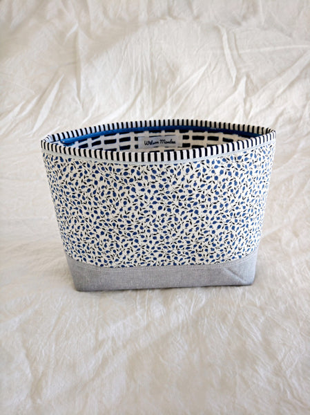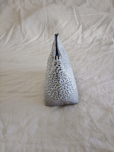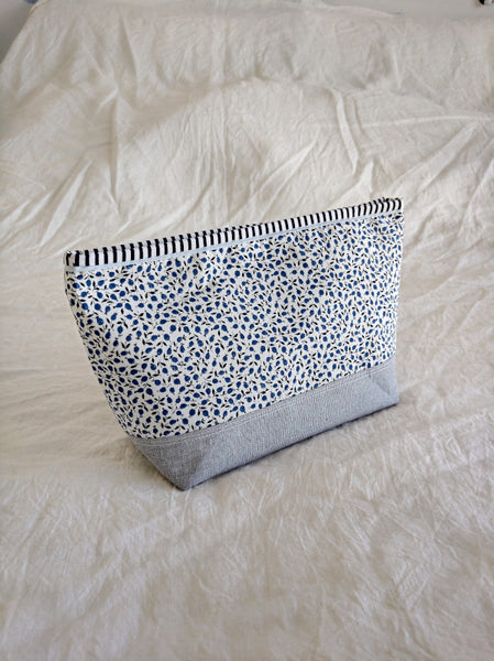 This beautiful zipper pouch features the bright and happy Liberty print Eloise with a contrasting Essex Yarn Died Linen in grey on the bottom and a striped band around the top for a little extra pop.  The lining on the inside is dark blue and white dash print of cotton. The grey linen on the bottom also has a metallic thread running through it to give it a very subtle shimmer.