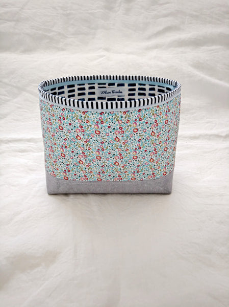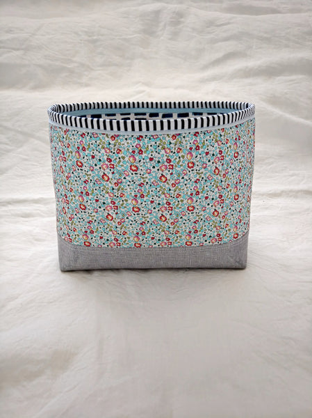 This beautiful zipper pouch features the bright and happy Liberty print Eloise with a contrasting Essex Yarn Died Linen in grey on the bottom and a striped band around the top for a little extra pop.  The lining on the inside is dark blue and white dash print of cotton. The grey linen on the bottom also has a metallic thread running through it to give it a very subtle shimmer.