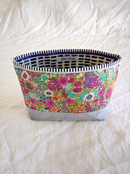 This beautiful zipper pouch features the bright and happy Liberty print Ciara A with a contrasting Essex Yarn Died Linen in grey on the bottom and a striped band around the top for a little extra pop. The lining on the inside is dark blue and white dash print of cotton. The grey linen on the bottom also has a metallic thread running through it to give it a very subtle shimmer.