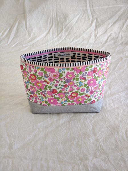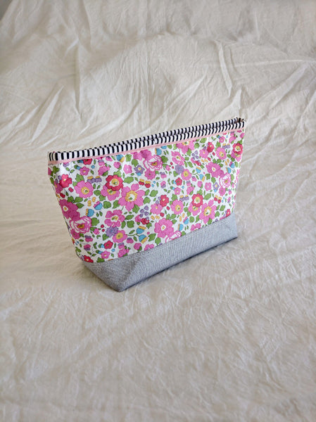 This beautiful zipper pouch features the bright and happy Liberty print Eloise with a contrasting Essex Yarn Died Linen in grey on the bottom and a striped band around the top for a little extra pop. The lining on the inside is dark blue and white dash print of cotton. The grey linen on the bottom also has a metallic thread running through it to give it a very subtle shimmer.