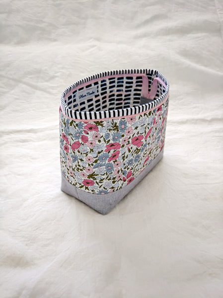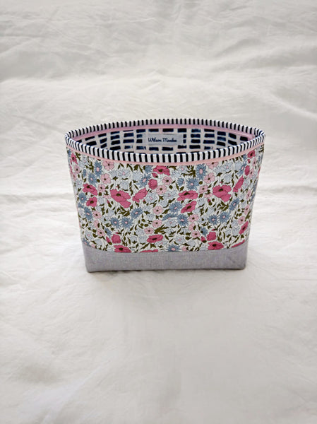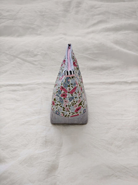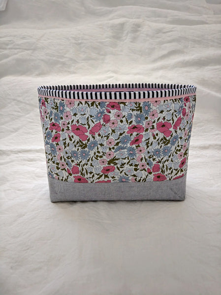 This beautiful zipper pouch features the bright and happy Liberty print Poppy and Daisy with a contrasting Essex Yarn Died Linen in grey on the bottom and a striped band around the top for a little extra pop.  The lining on the inside is dark blue and white dash print of cotton.