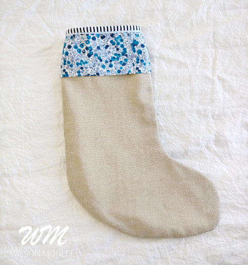 The cuff of this stocking is made with Liberty of London Tana Lawn fabric in the Blue Wiltshire colourway.